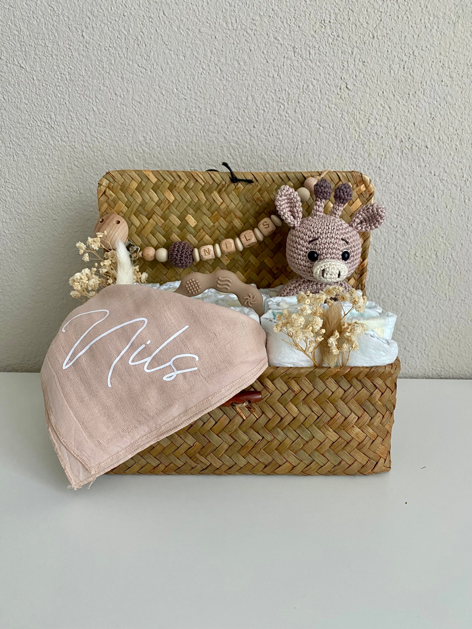 Der grosse Windelkorb hat eine Grösse von 29x19x12cm und beinhaltet 40 Stk. Windeln. (Gr. 2, Pampers Premium Protection) Die Deko mit Trockenblumen ist inklusive. Der Korb kann danach perfekt für die Wickelkommode verwendet werden.